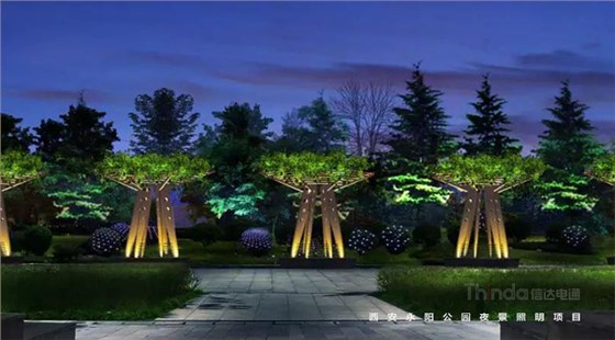 內透照明:即枝葉間有較多空隙,且樹葉透明的植被,可將燈具放置于枝干的下部靠近或接近地面的位置,創造出枝葉發光的效果。