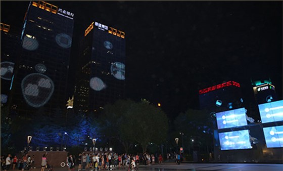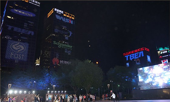 隨后觀摩燈光秀展演及周邊夜景亮化效果。北廣場上絢麗多彩的燈光秀吸引了不少路人駐足欣賞。這里的燈光秀為國內首次在戶外應用機器人臂舞動LED屏幕,不斷變換的美麗圖案、不斷閃爍的彩燈令人應接不暇。沿著錦業路、唐延路、科技路一路向北,這里的彩燈最為集中,也最璀璨照人。
