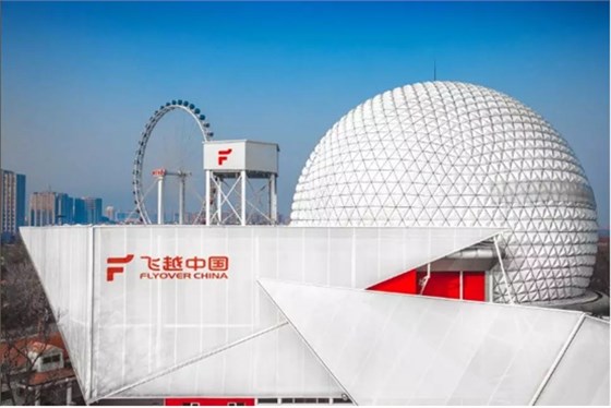 “飛越中國”是由飛覽天下文化發展有限公司潛心打造的飛行影院文娛觀賞項目。影院配置突破傳統院線場地、環境的限制,整個設備擁有六自由度運動平臺座椅、4臺4K激光投影機、直徑20米的球形巨幕及15.1聲道音響,加上急速拉升、失重、俯沖等各種模擬真實的飛行體驗以及噴水霧、吹風、香霧等特效。