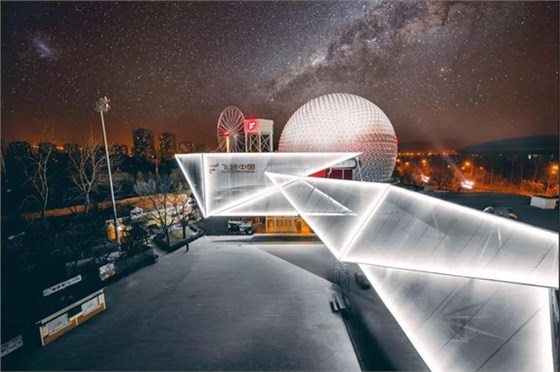 影院高32.8米,總占地總面積3600平方米。外觀的球形頂,代表著神秘浩瀚的宇宙和閃爍星空,神秘又等待著探索。外圍建筑狀似飛翼,采用的是鋼絲膜強化來建筑造型,展現建筑“飛躍”之勢,正與“飛越中國”這一主題相契合!