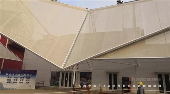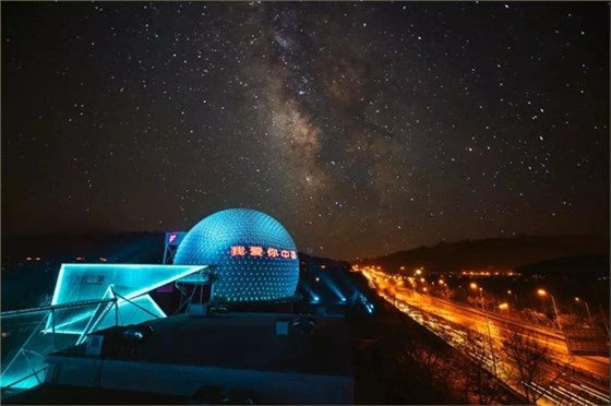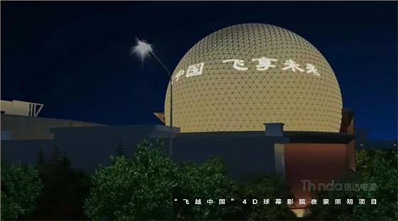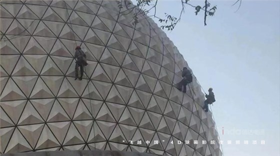 隨著球幕外立面光色切換,“我愛你中國”、“飛覽天下飛越中國”等主題字幕滾動播出。為實現預期的設計效果,信達團隊多次夜間試燈。