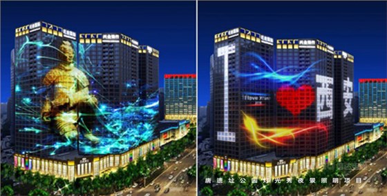 以民生為落腳點,打造品質西安、共享幸福西安,有一種東西,讓你無法抗拒,那就是追憶。同時借用建筑多媒體立面,采用LED點光源形成大屏幕,打造立面顯示屏效果,進行與地面景觀、樹林、機械臂顯示屏進行聯動顯示。