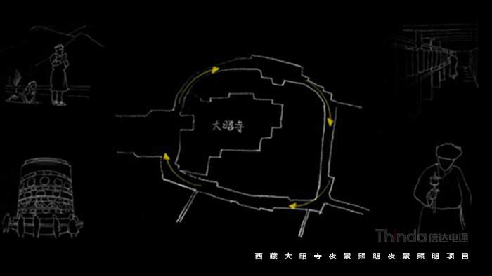 3)重大節(jié)日模式下所有照明燈具全開,重要節(jié)點(diǎn)投影經(jīng)文開啟,使大昭寺成為一個巨大的轉(zhuǎn)經(jīng)筒與朝拜的人一起緩緩轉(zhuǎn)動。