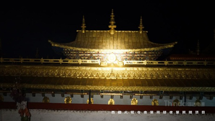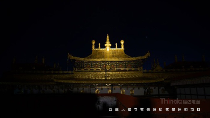 大昭寺是四層樓的碉堡式建筑結(jié)構(gòu),各殿宇樓頂形狀高低不一,為全面營造金頂?shù)囊归g氛圍,信達(dá)科技采用投光燈投射金頂?shù)脑O(shè)計方案。投光燈分布在圍繞大昭寺的十個點(diǎn)位上,根據(jù)被照物高度、角度設(shè)置燈具數(shù)量、高度、角度、方向,以實(shí)現(xiàn)金頂?shù)恼w亮度統(tǒng)一。
