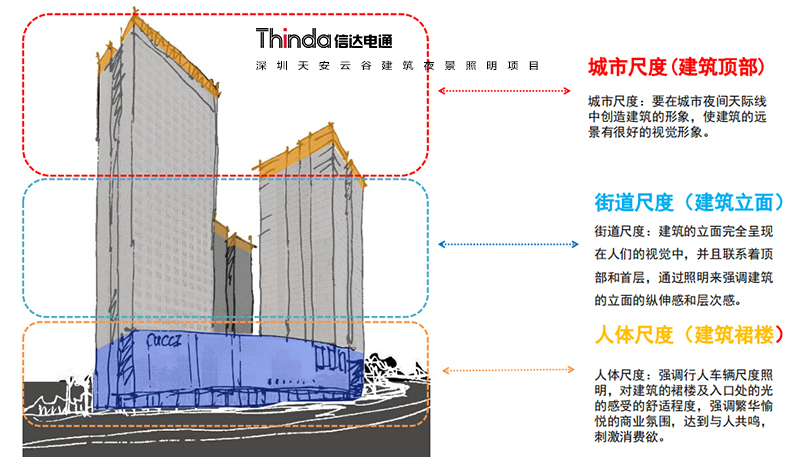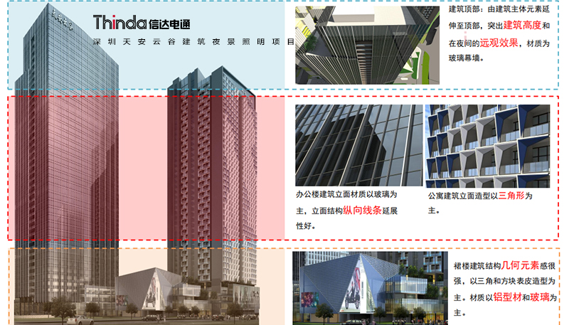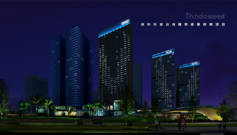深圳天安云谷夜景照明建筑本身由建筑主體元素延伸至頂部,突出建筑高度和在夜間的遠觀效果,材質為玻璃幕墻。辦公樓建筑立面材質為玻璃為主,立面結構縱向延展性好。