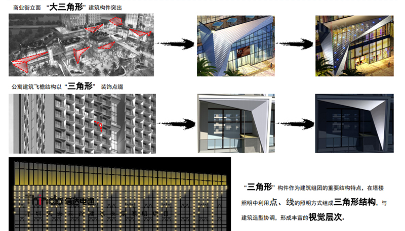 建筑夜景照明設計依照其建筑本身特性、功能定位和整體的文化需求,本案中設計師依據實際情況進行照明設計,對于建筑不同高度平面進行相對視角分析,不同角度效果和要求各有不同。
